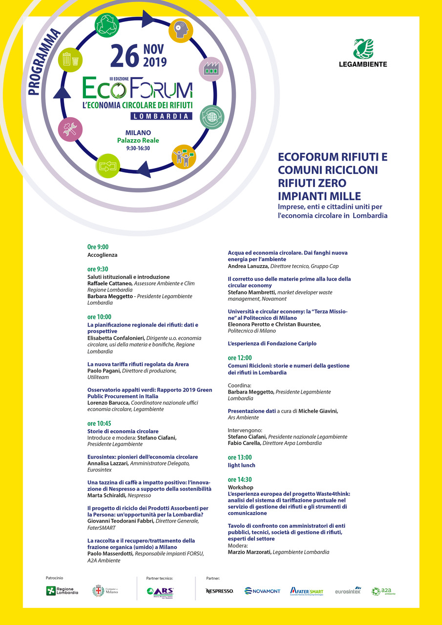 Martedì 26 Novembre 2019, dalle 9.30 alle 16.30, a Milano, Palazzo Reale, si terrà la terza edizione di ECOFORUM: l’economia circolare dei rifiuti in Lombardia – organizzato da Legambiente con il patrocinio di Regione Lombardia e Comune di Milano.